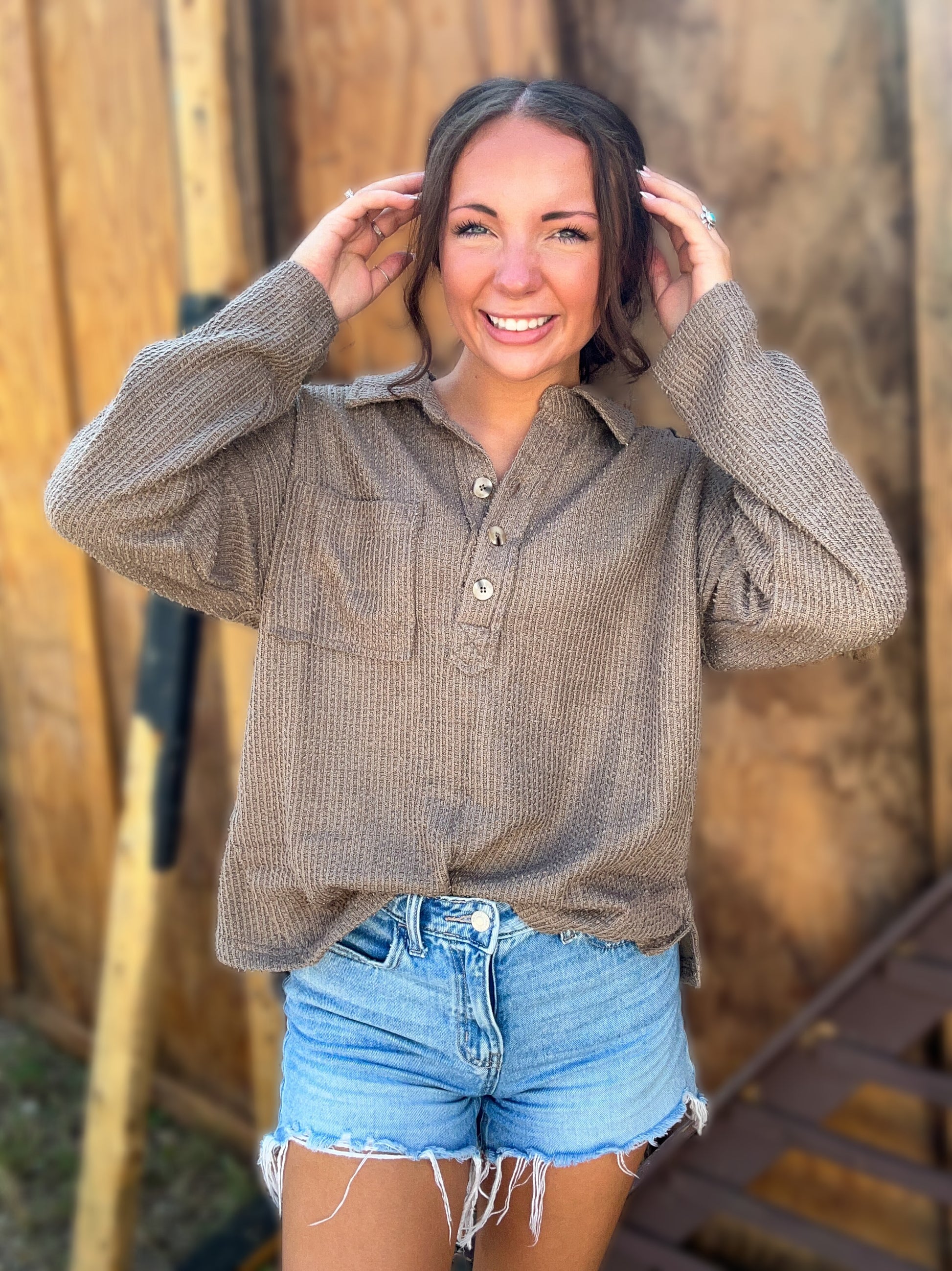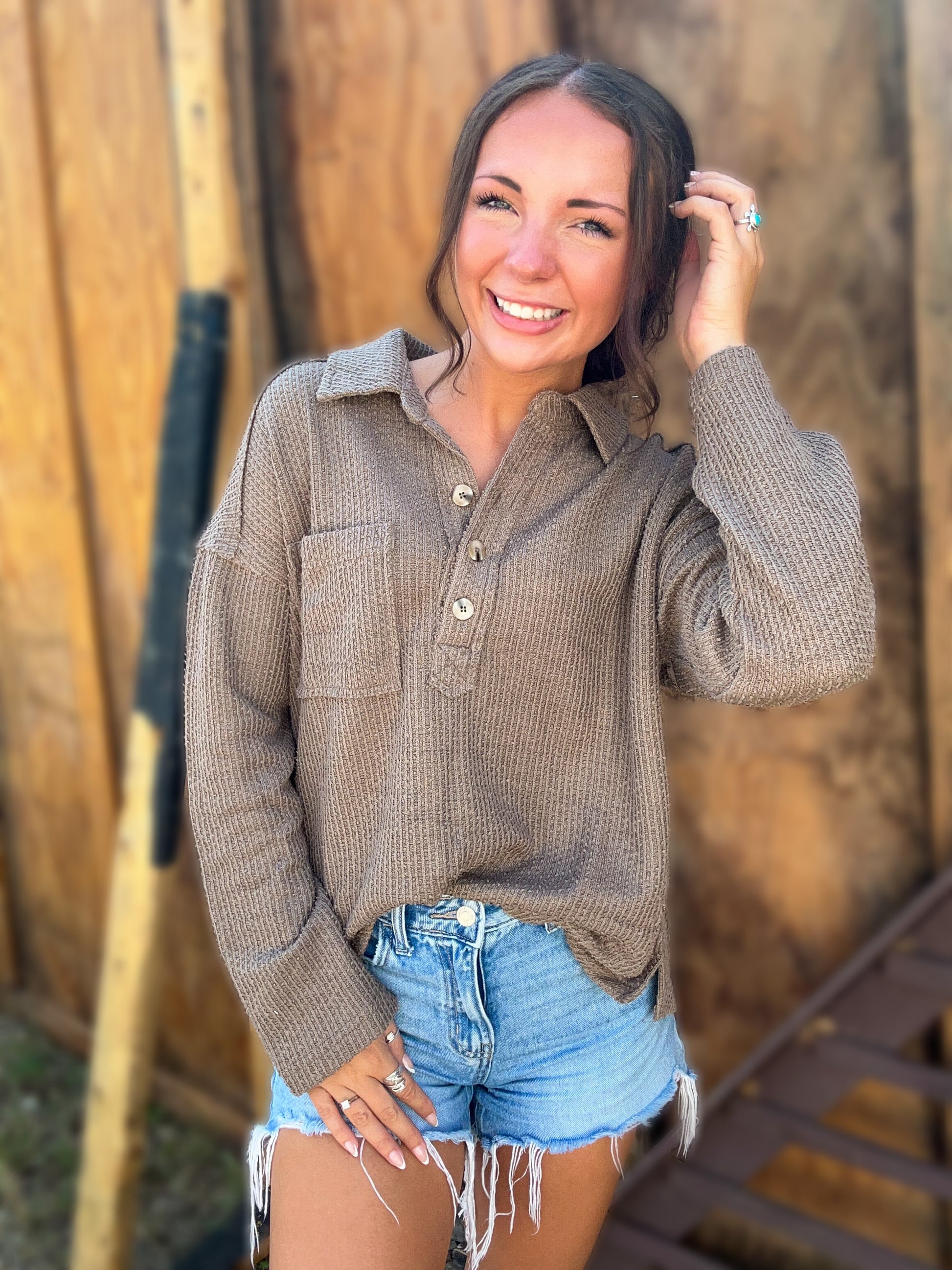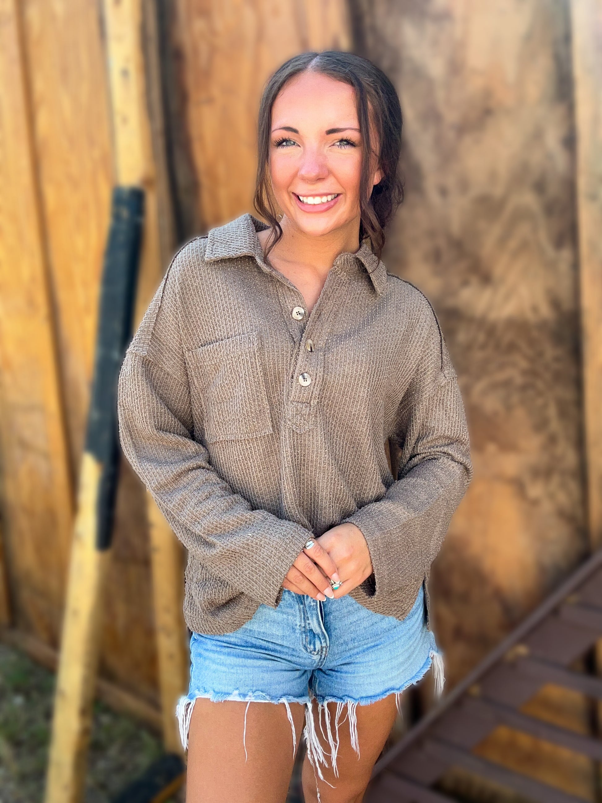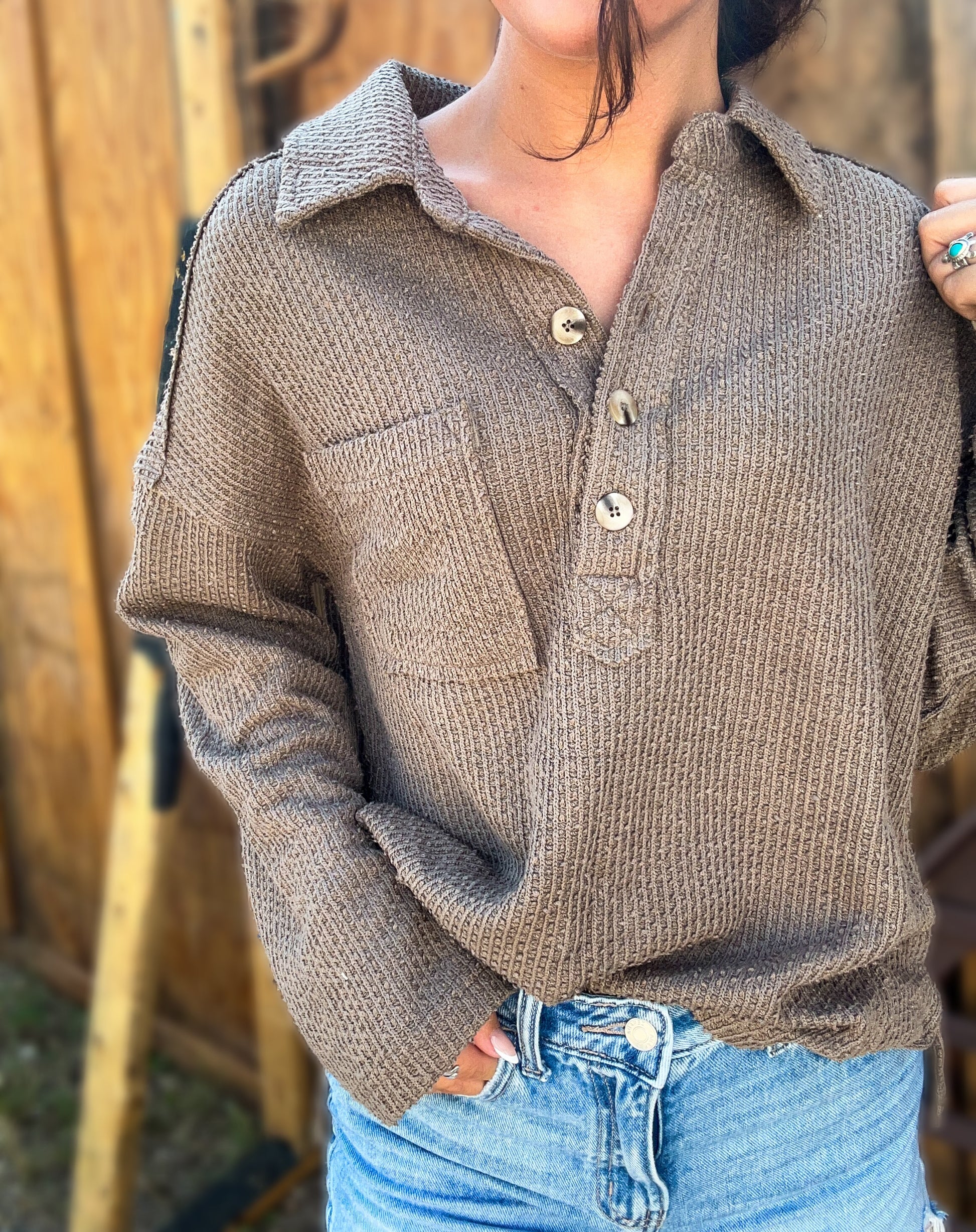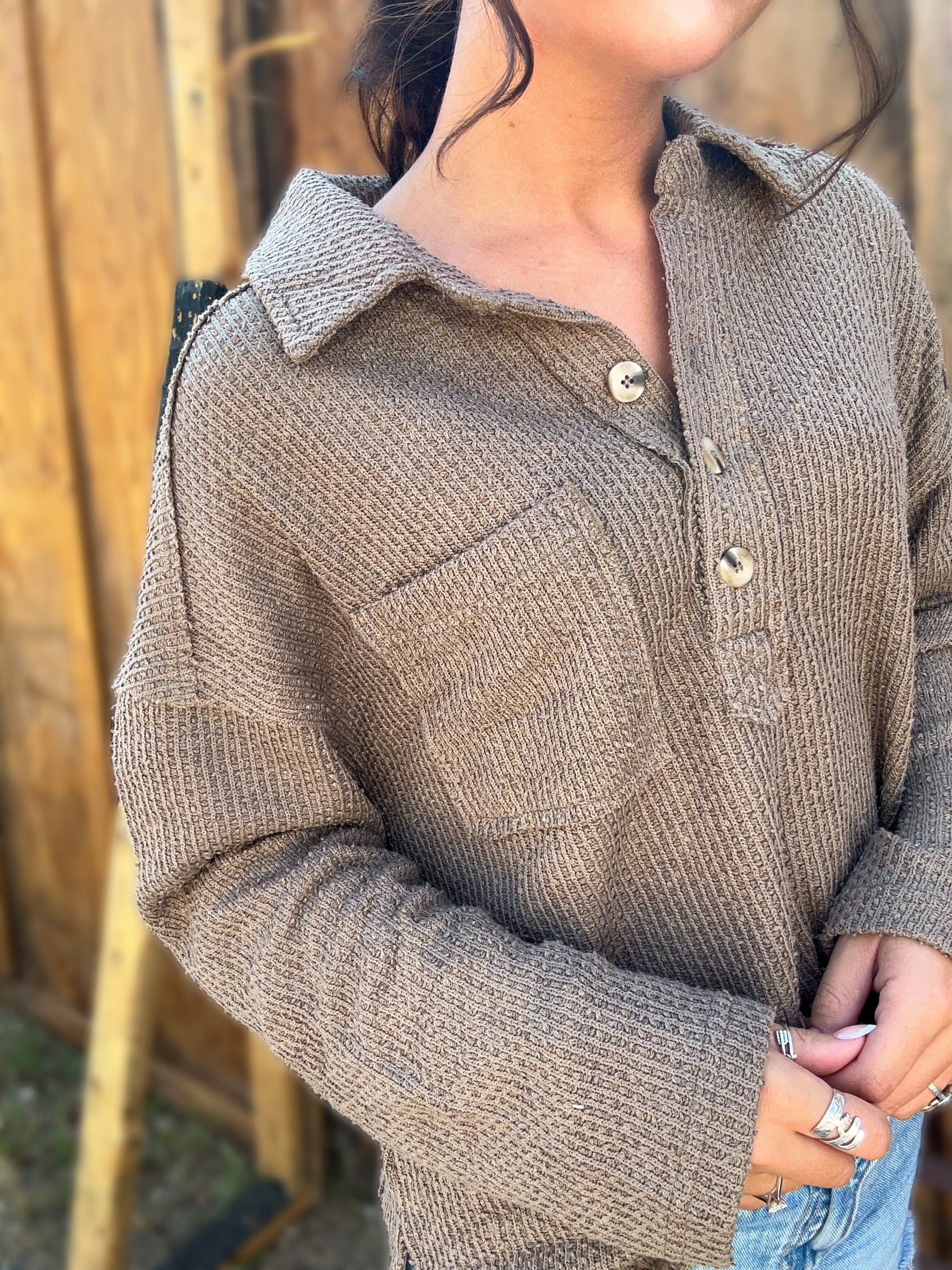 The Decatur Shacket is the perfect mix of cozy and casual. Made from a soft, textured knit, it features a relaxed, oversized fit that makes it easy to layer. The collared neckline and button-down front give it a classic shirt-jacket vibe, while the roomy front pocket adds both function and style. Wide sleeves with a comfortable drop-shoulder design keep the look laid-back, and the neutral taupe-brown shade makes it super versatile for fall and winter outfits.