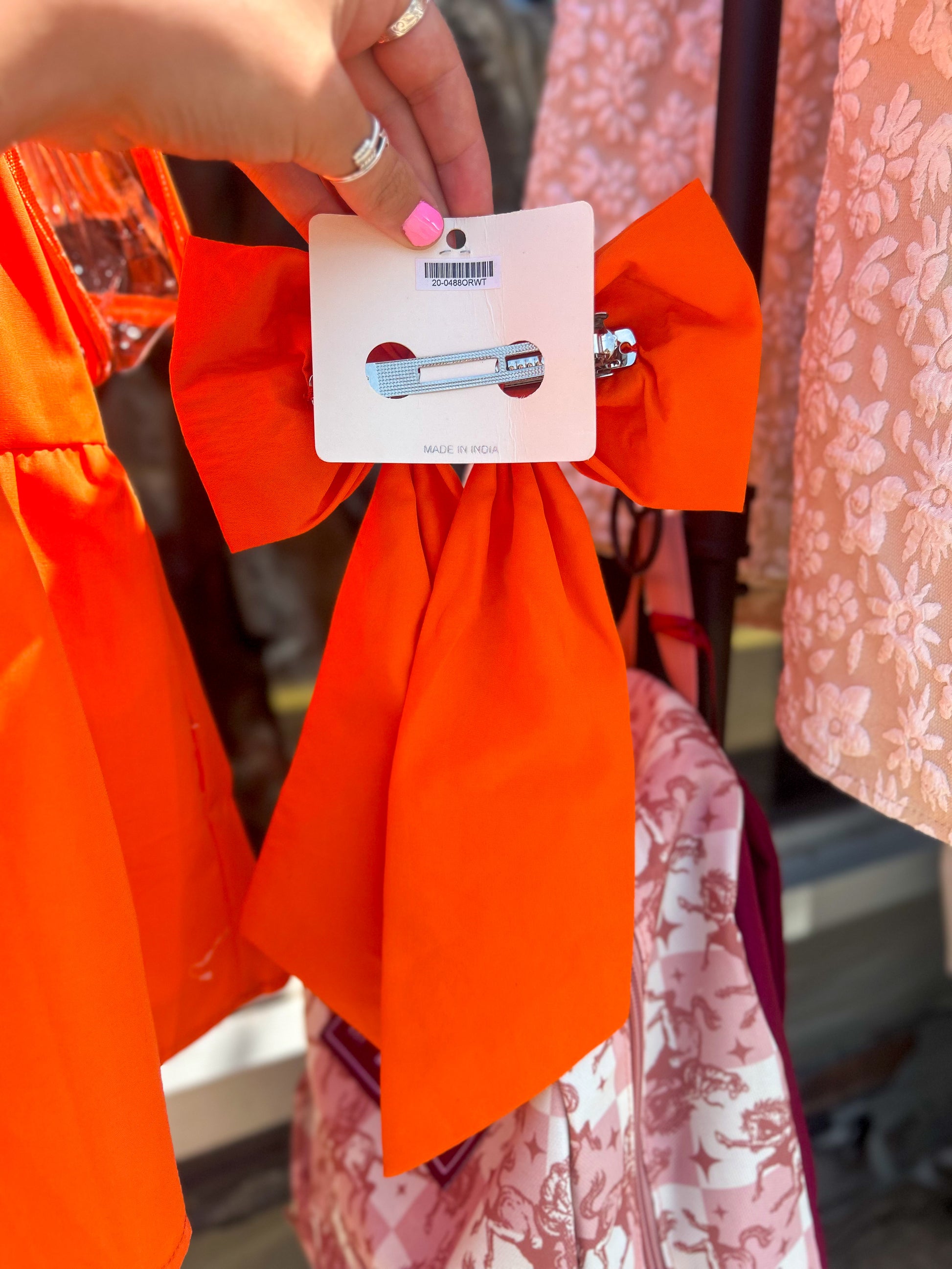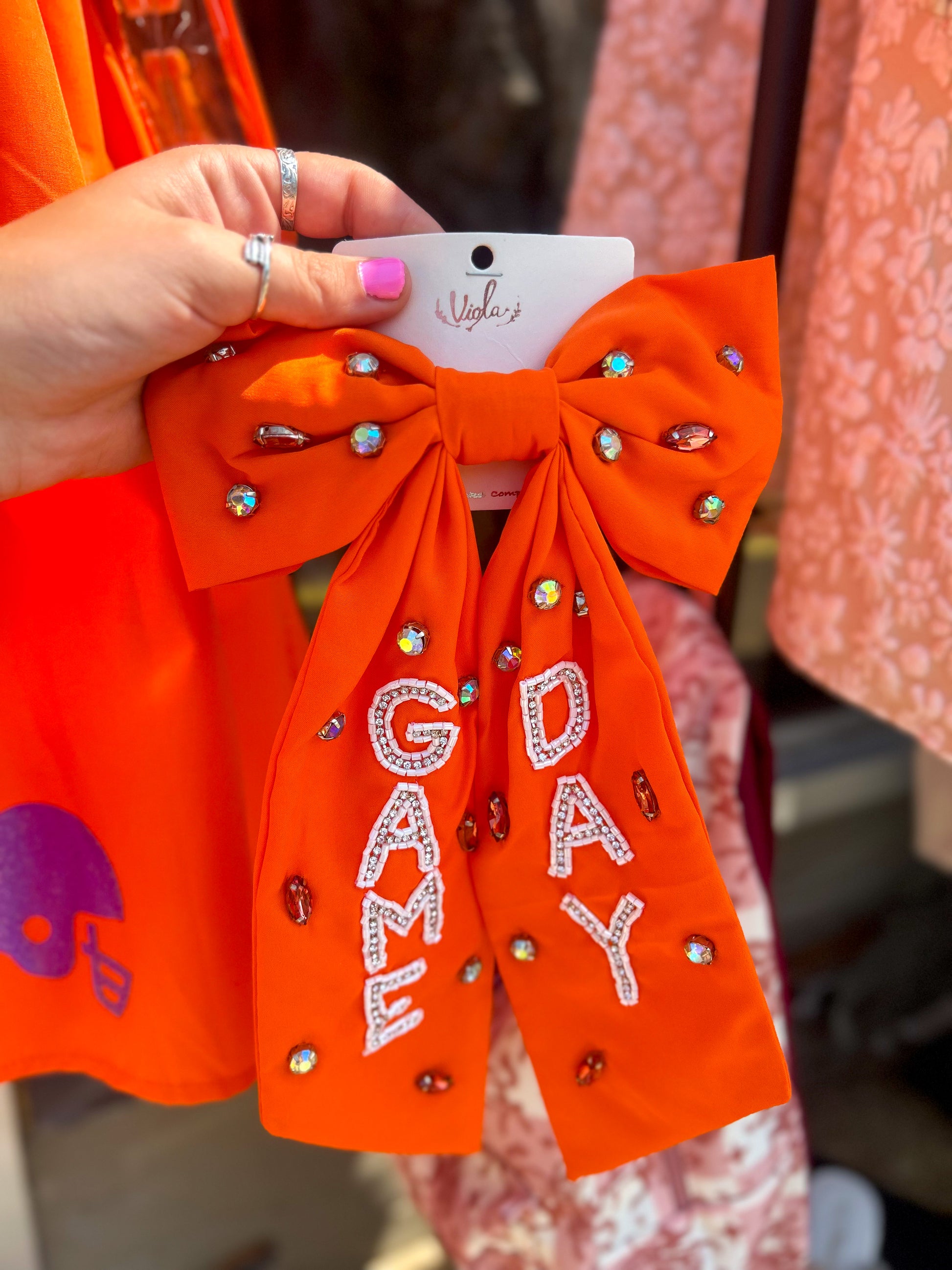 Add the ultimate finishing touch to your Friday Night Lights look with this bold and spirited bow! Featuring a vibrant orange base embellished with sparkling rhinestones and beaded “GAME DAY” lettering, this barrette is perfect for showing off your team pride. Easy to clip in and statement-making, it’s the go-to accessory for cheering under the lights in style.