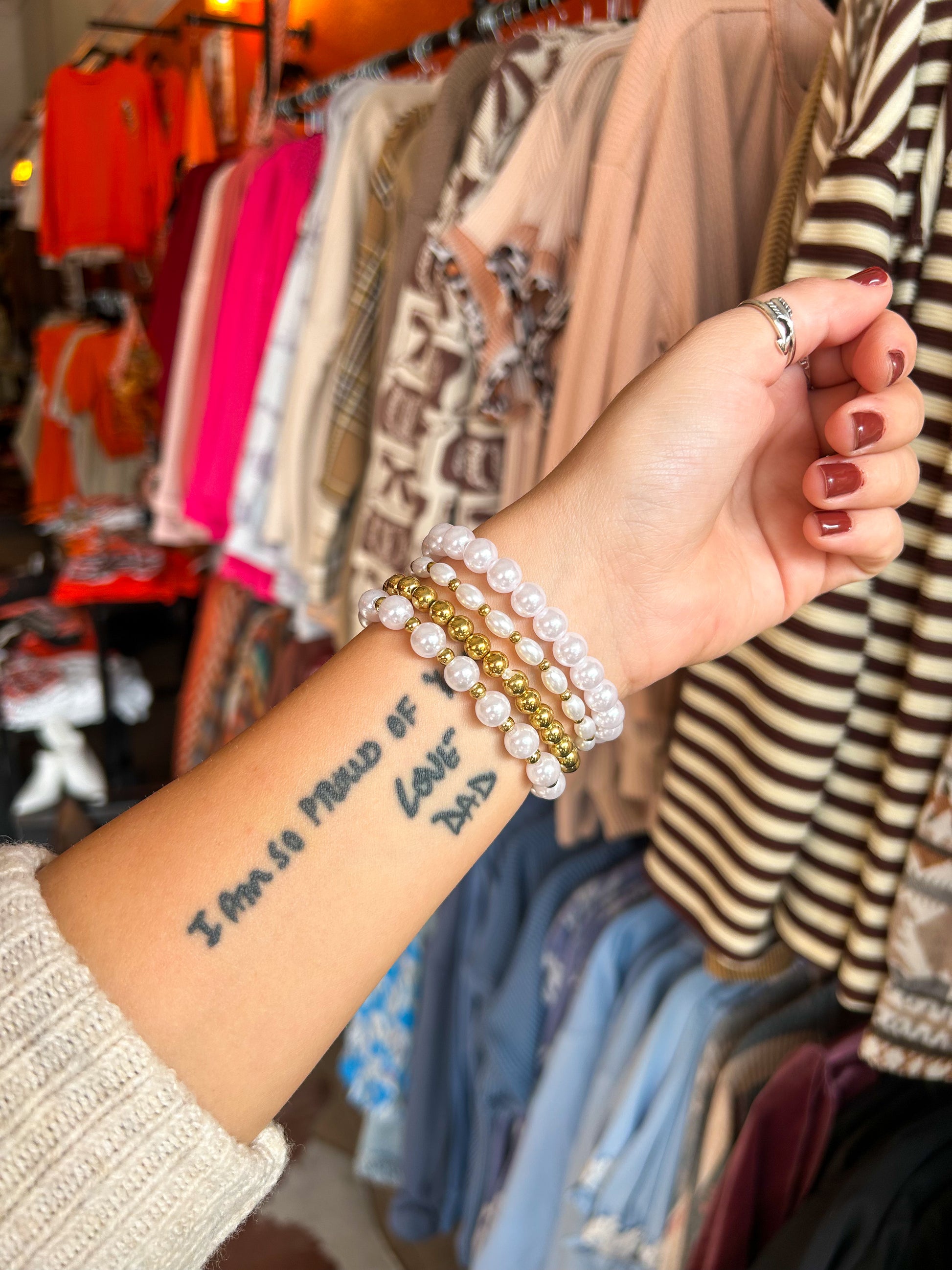 The Hearts of Gold Bracelet Stack is the perfect blend of classic charm and sweet, feminine shine. This four-piece stack features glossy pearl beads paired with polished gold rounds for the dreamiest mixed-metal moment. The standout detail? A pair of gold heart beads that add the cutest romantic touch to the whole look.