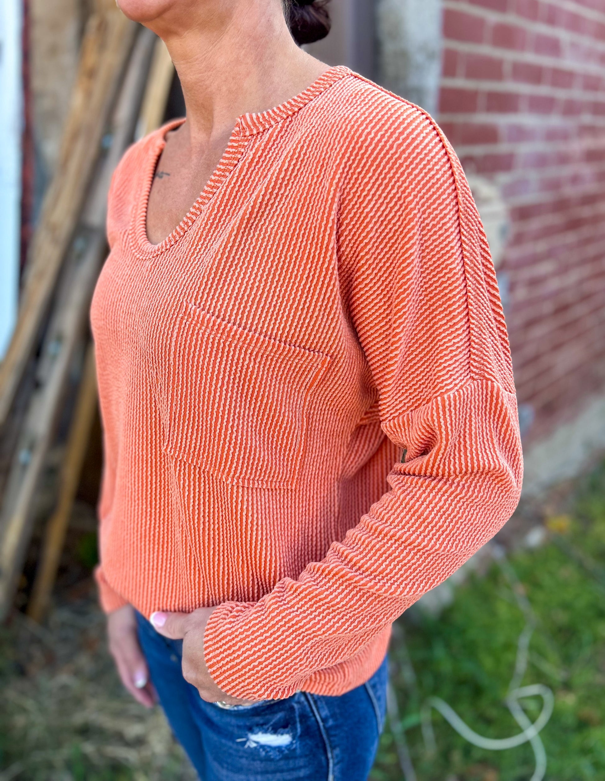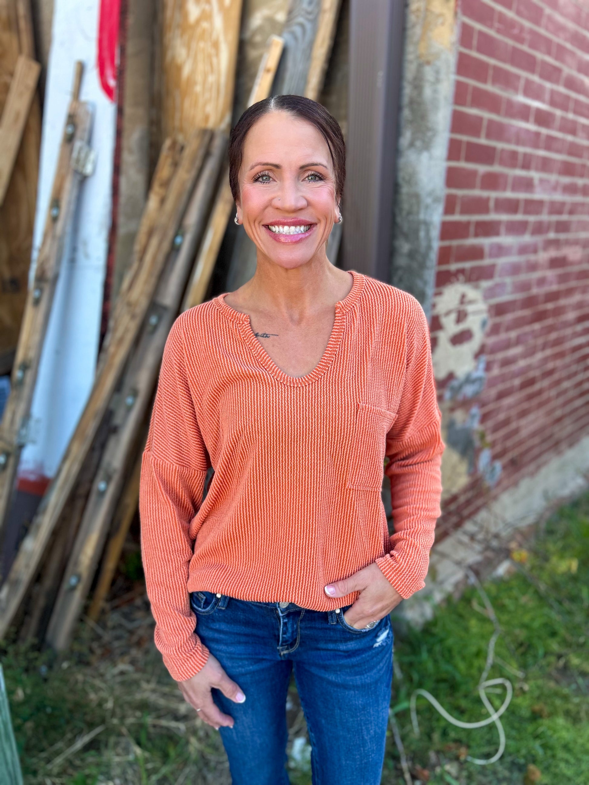 The Jessie Top is your new go-to for effortless everyday style! Featuring a soft, ribbed knit fabric and a relaxed fit, this top keeps you comfy while looking cute. The split neckline and front pocket add the perfect touch of laid-back detail, and the warm rust color makes it ideal for fall days. Pair it with your favorite denim and boots for an easy, put-together look that works from coffee runs to weekend outings.