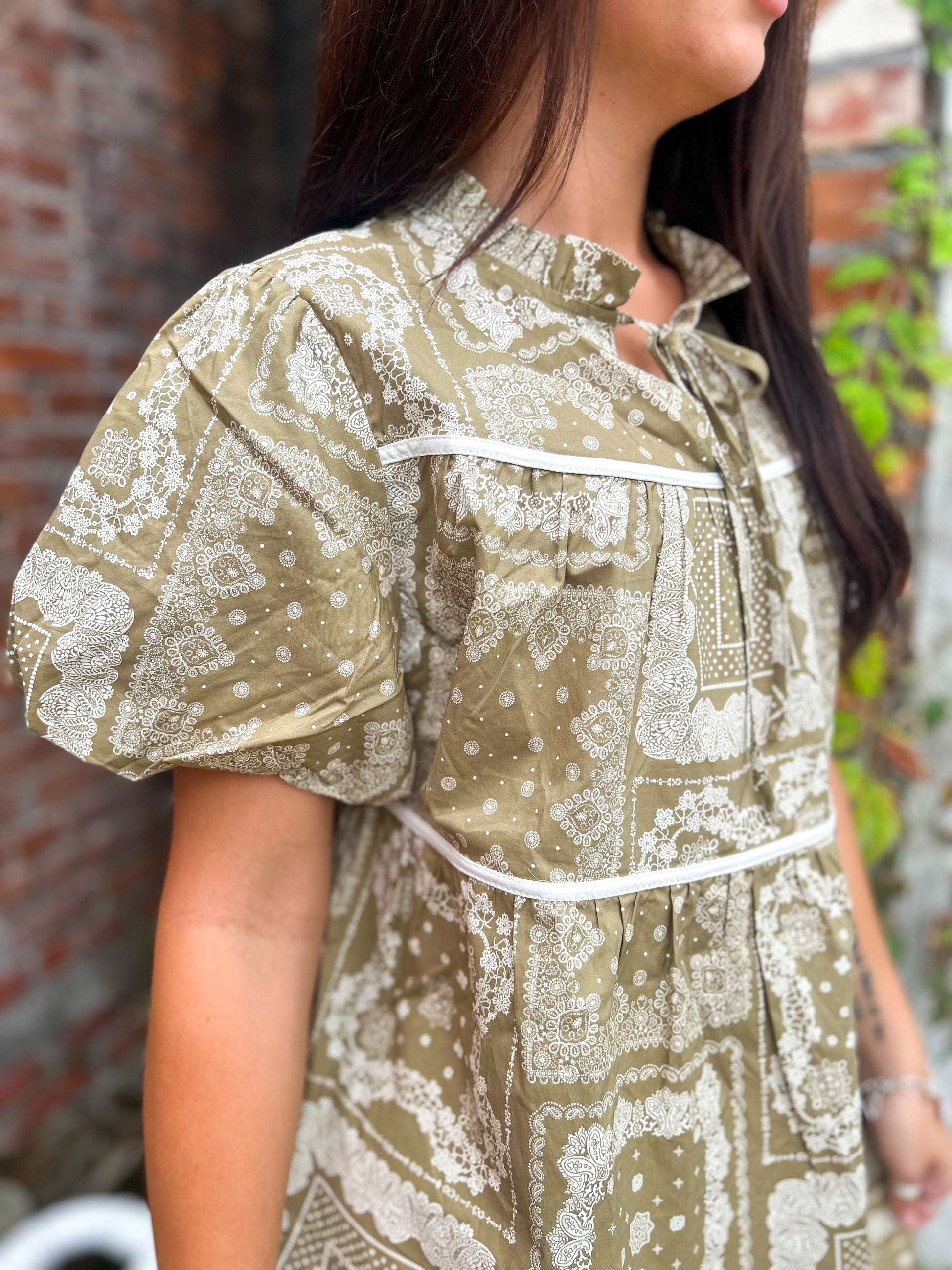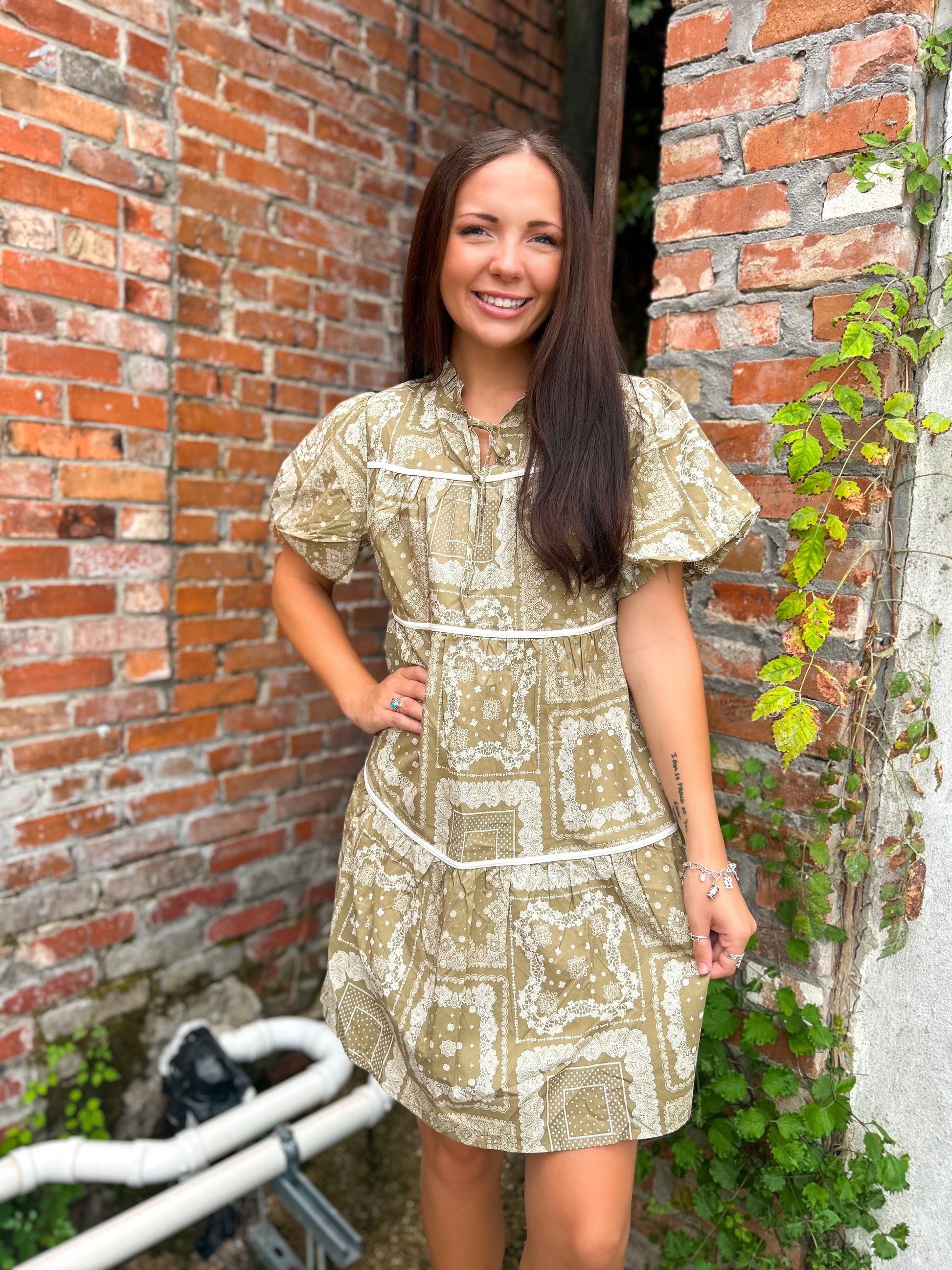 The Livin’ On Love Dress is the perfect blend of comfort and charm! This tiered mini dress features a soft, flowy silhouette with short puff sleeves and a relaxed fit that’s flattering and easy to wear. Designed in a neutral olive and cream bandana-style print, it adds a playful, Western-inspired twist to your wardrobe. The neckline ties at the top for a sweet, feminine touch, while subtle piping detail throughout adds structure and interest. Whether you’re heading to a weekend market or a casual night out, this dress is all about easygoing style and livin’ on love.