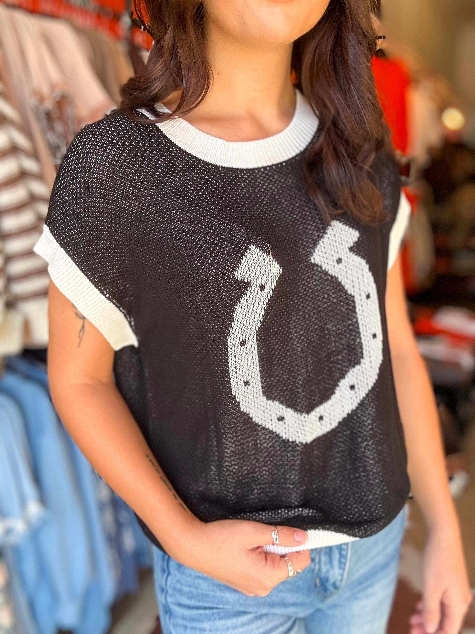 Add a little good fortune to your closet with our Luck of the Draw Top! This lightweight, open-weave knit features a bold white horseshoe graphic on a sleek black base, paired with contrast trim for the perfect retro-western vibe. Soft, breathable, and easy to style, it’s the kind of top that looks effortlessly cute whether you dress it up or keep it casual. A true lucky charm for every cowgirl’s wardrobe.