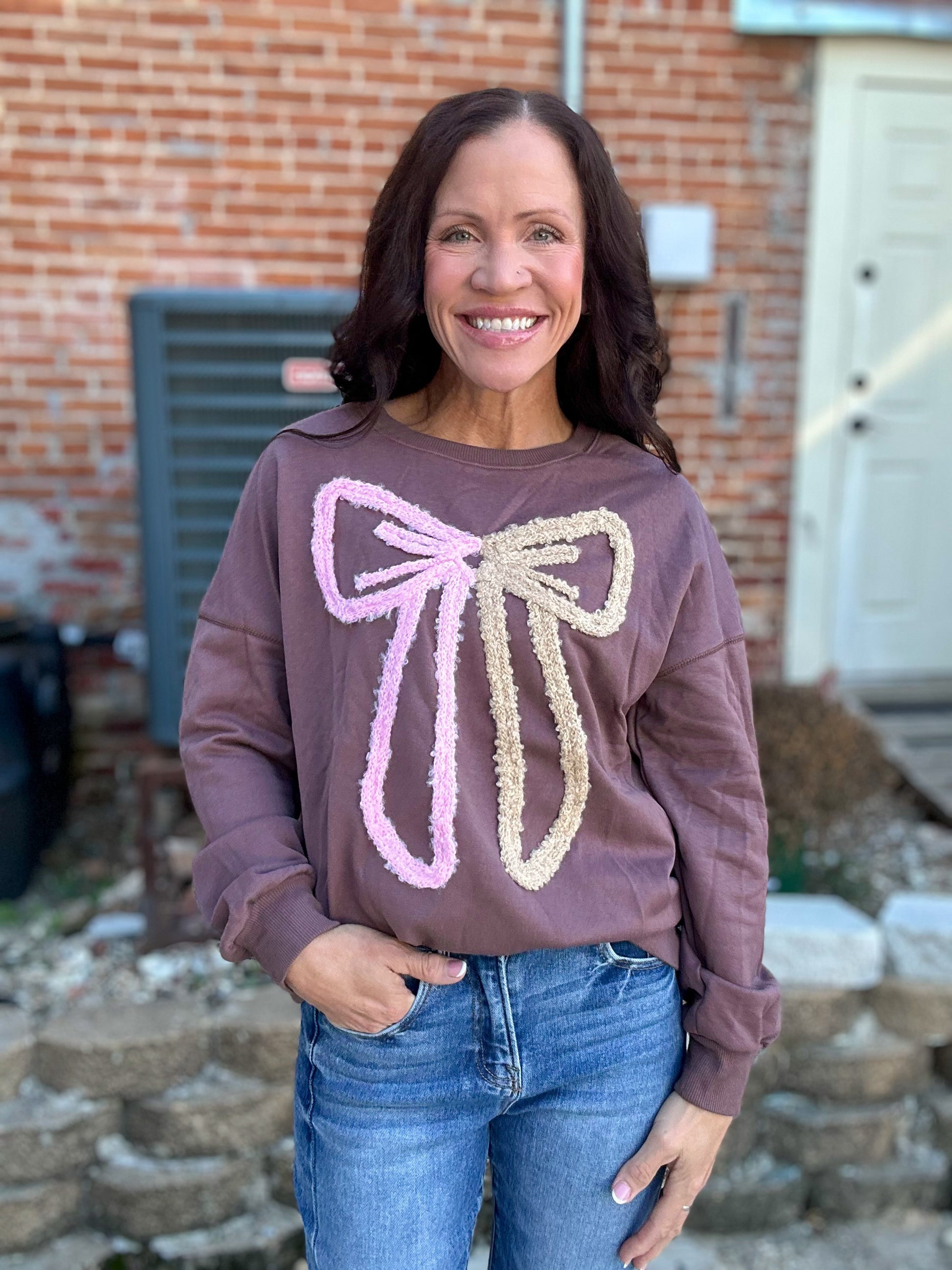 The Magnolia Bow Sweater combines cozy comfort with a feminine touch. This mocha-colored sweatshirt features a soft fleece interior and a textured chenille bow design in blush and cream. Its relaxed fit makes it easy to style with jeans or leggings for a casual yet put-together look. Perfect for adding a hint of sweetness to your everyday wardrobe.