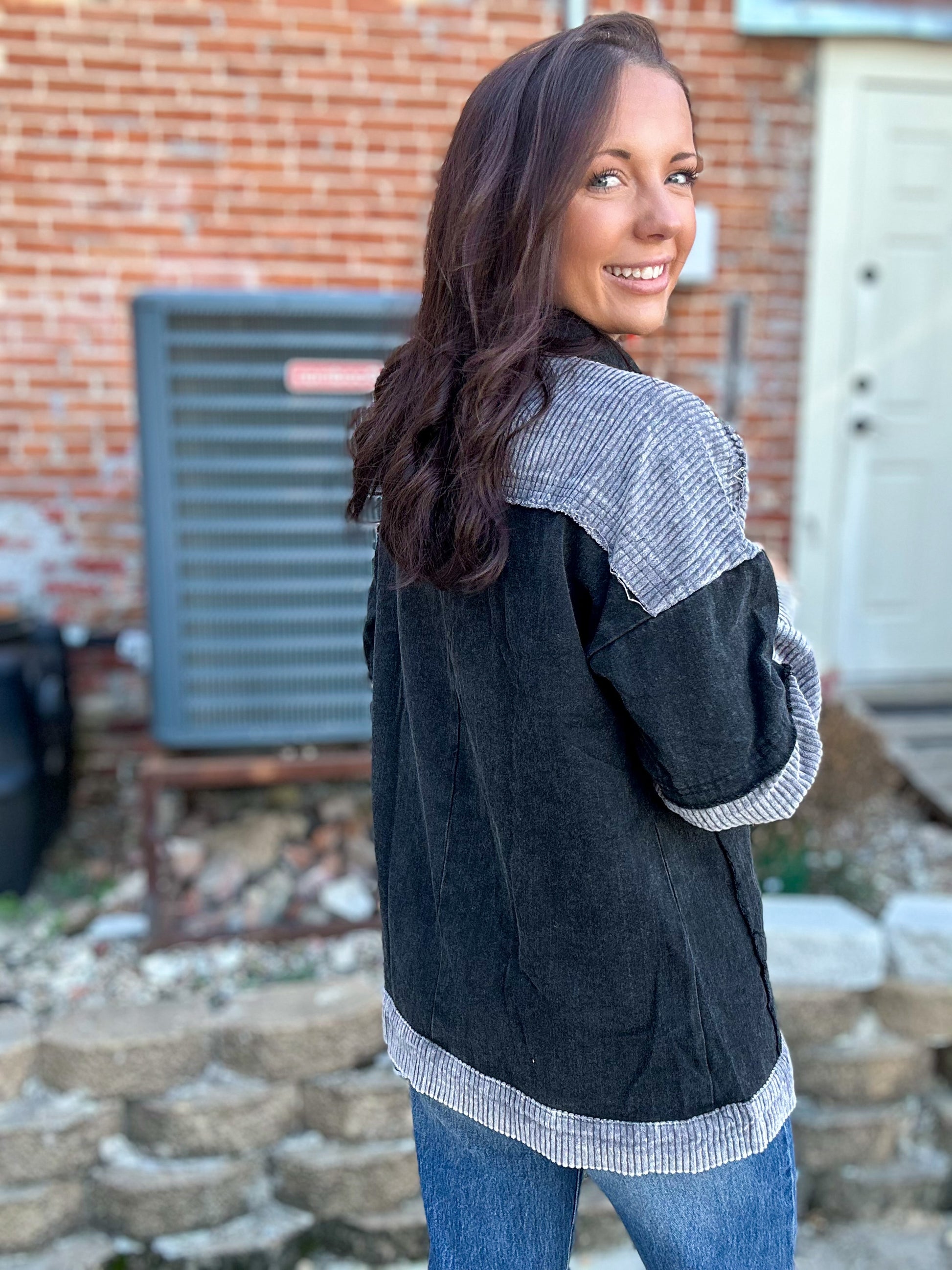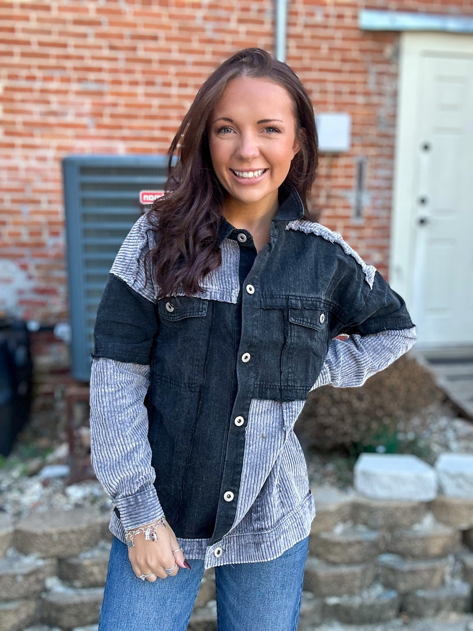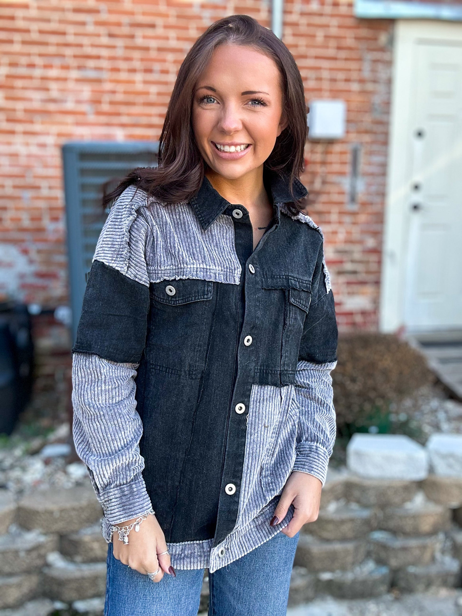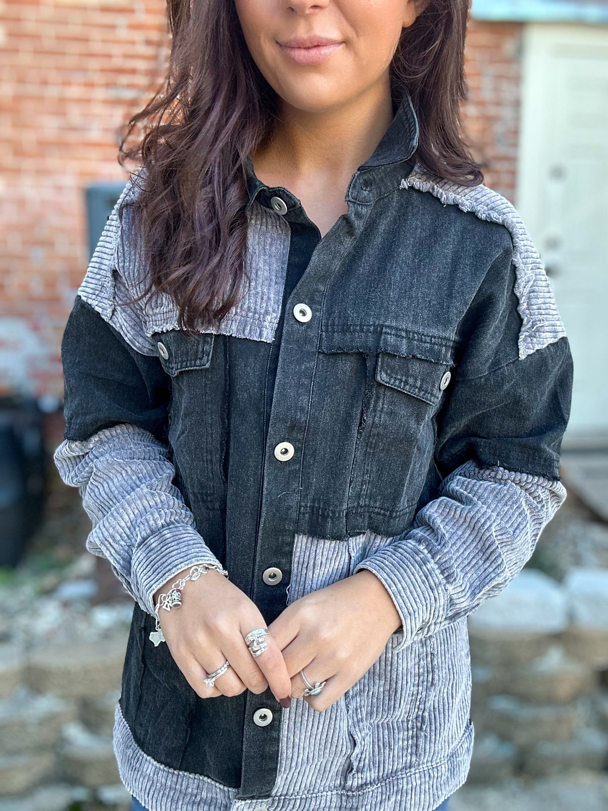 The Rio Grande Shacket is a bold mix of classic western grit and casual comfort. Featuring a contrast patchwork design of washed black denim and soft gray corduroy, it brings a rugged yet cozy vibe to any outfit. The button-front style, chest pockets, and frayed detailing at the shoulders add a touch of vintage charm, making it the perfect piece to throw on for cool-weather days.