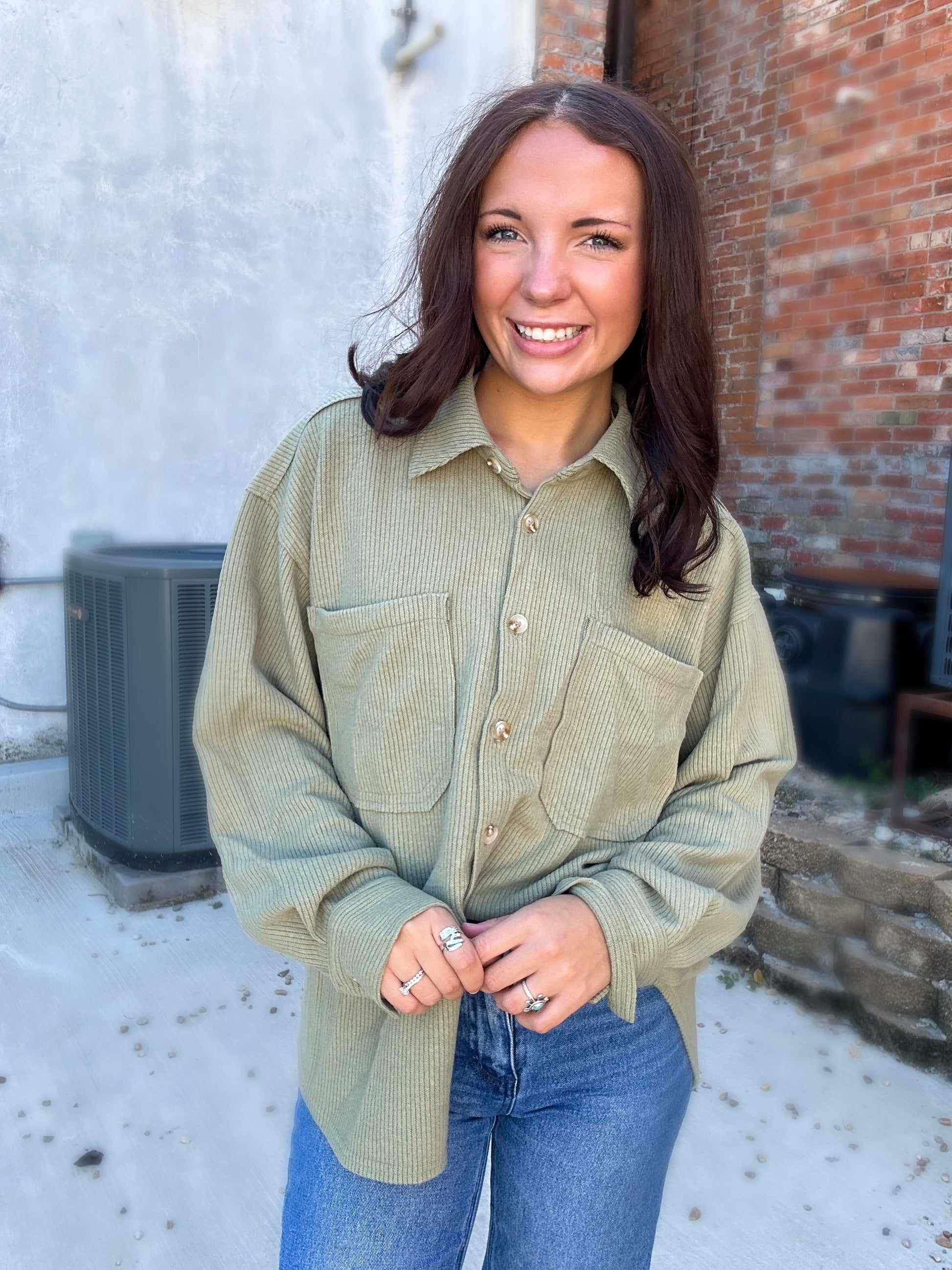 The Sloan Shacket is your ultimate fall layering piece. Featuring a soft ribbed corduroy texture in a neutral sage tone, this oversized button-down is as comfy as it is versatile. With front chest pockets, cuffed sleeves, and a relaxed fit, it brings that effortless cool-girl western vibe to any outfit.