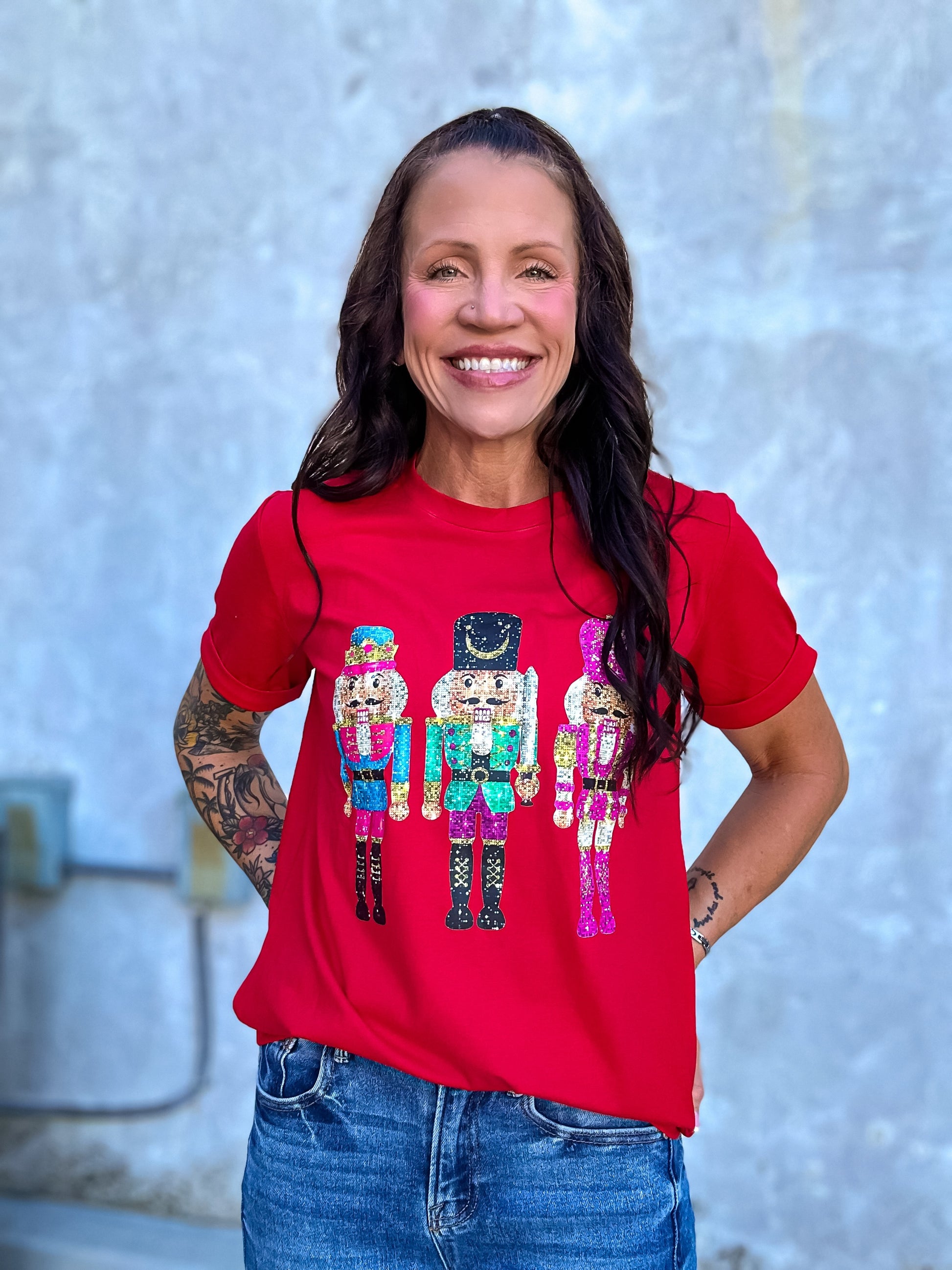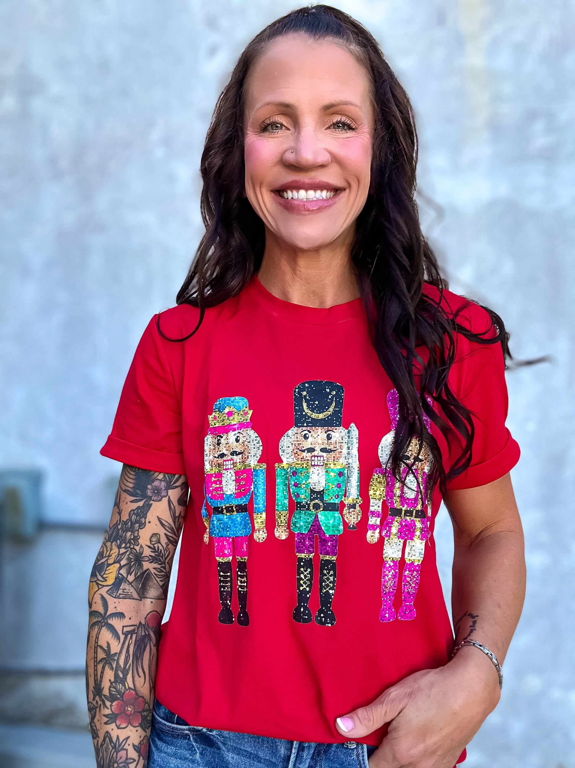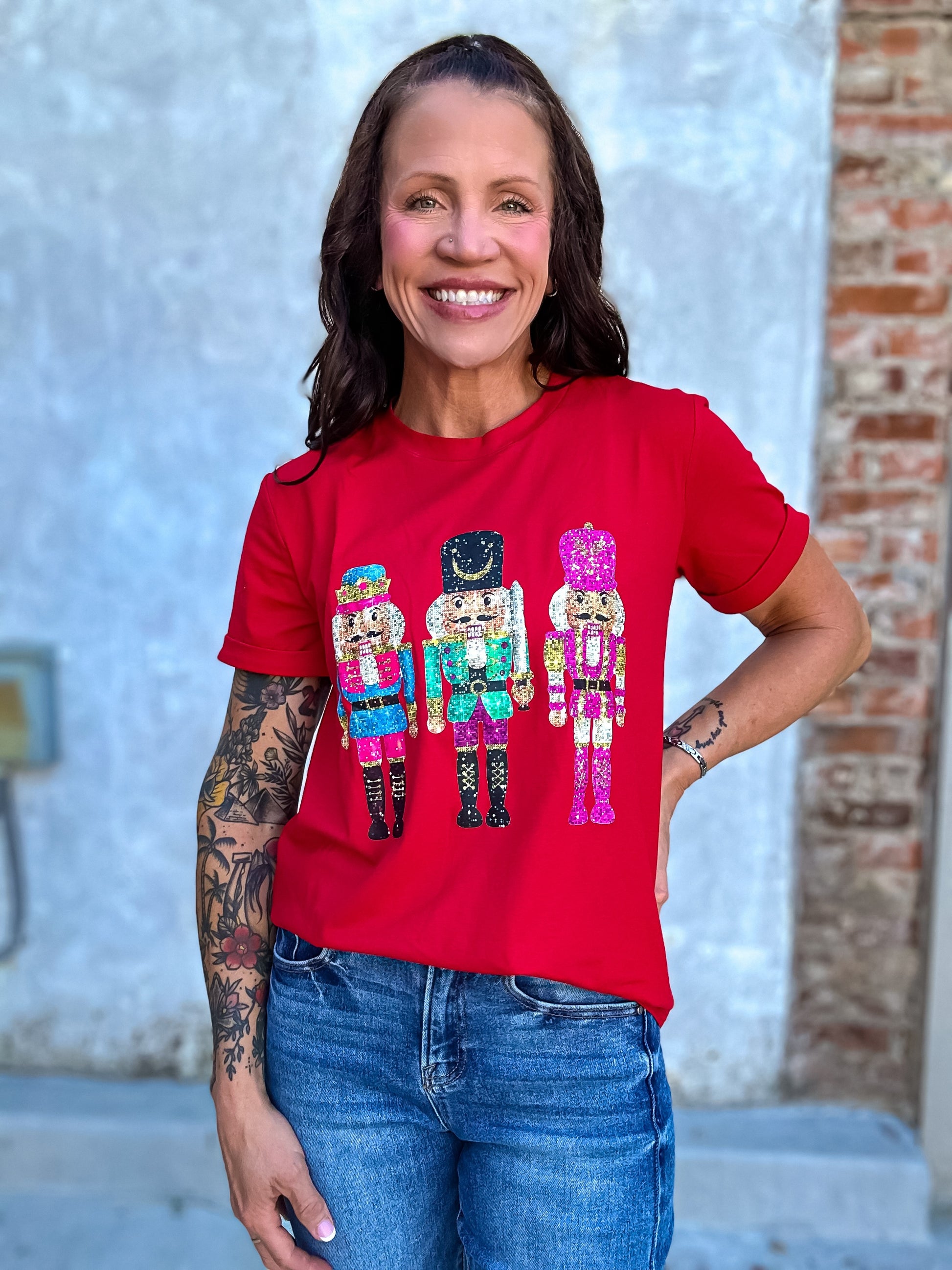Add some festive flair to your holiday wardrobe with this dazzling red tee! Featuring three sequin-covered nutcrackers in bright, cheerful colors, the Sparkling Soldiers Top brings all the merry magic of Christmas in one bold look. Perfect for holiday parties, parades, or just spreading Christmas cheer all season long.
