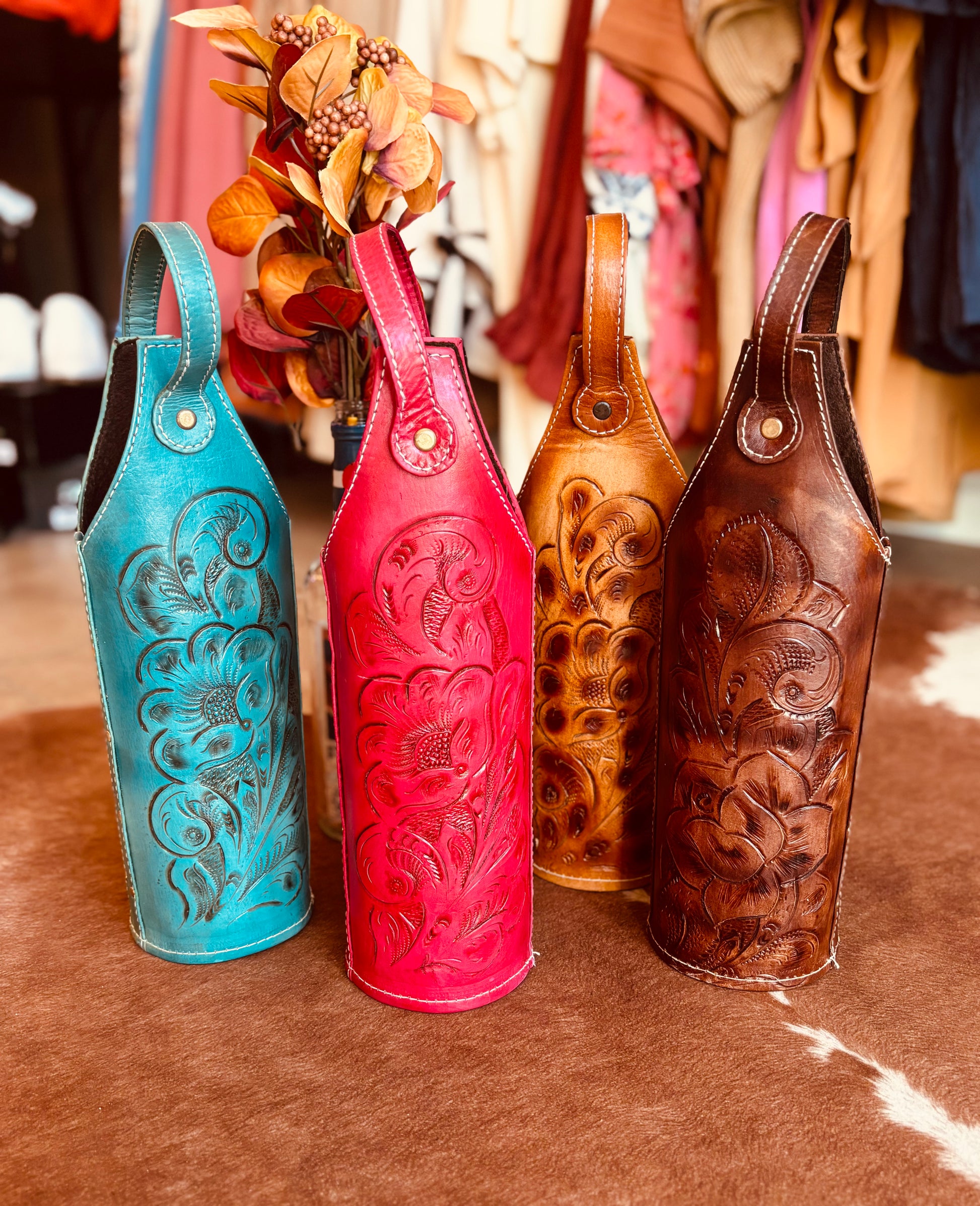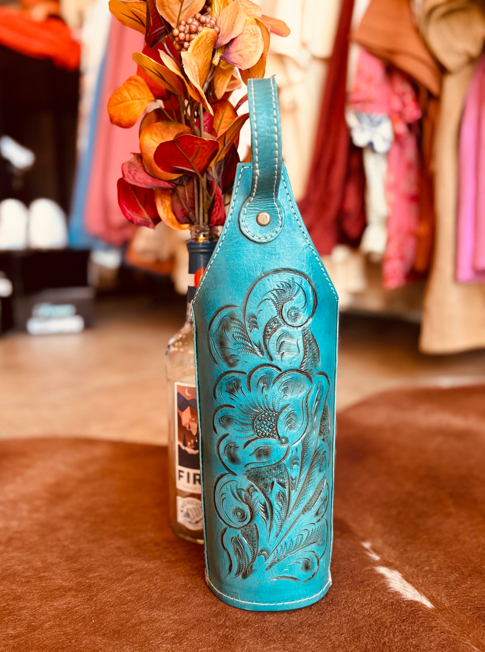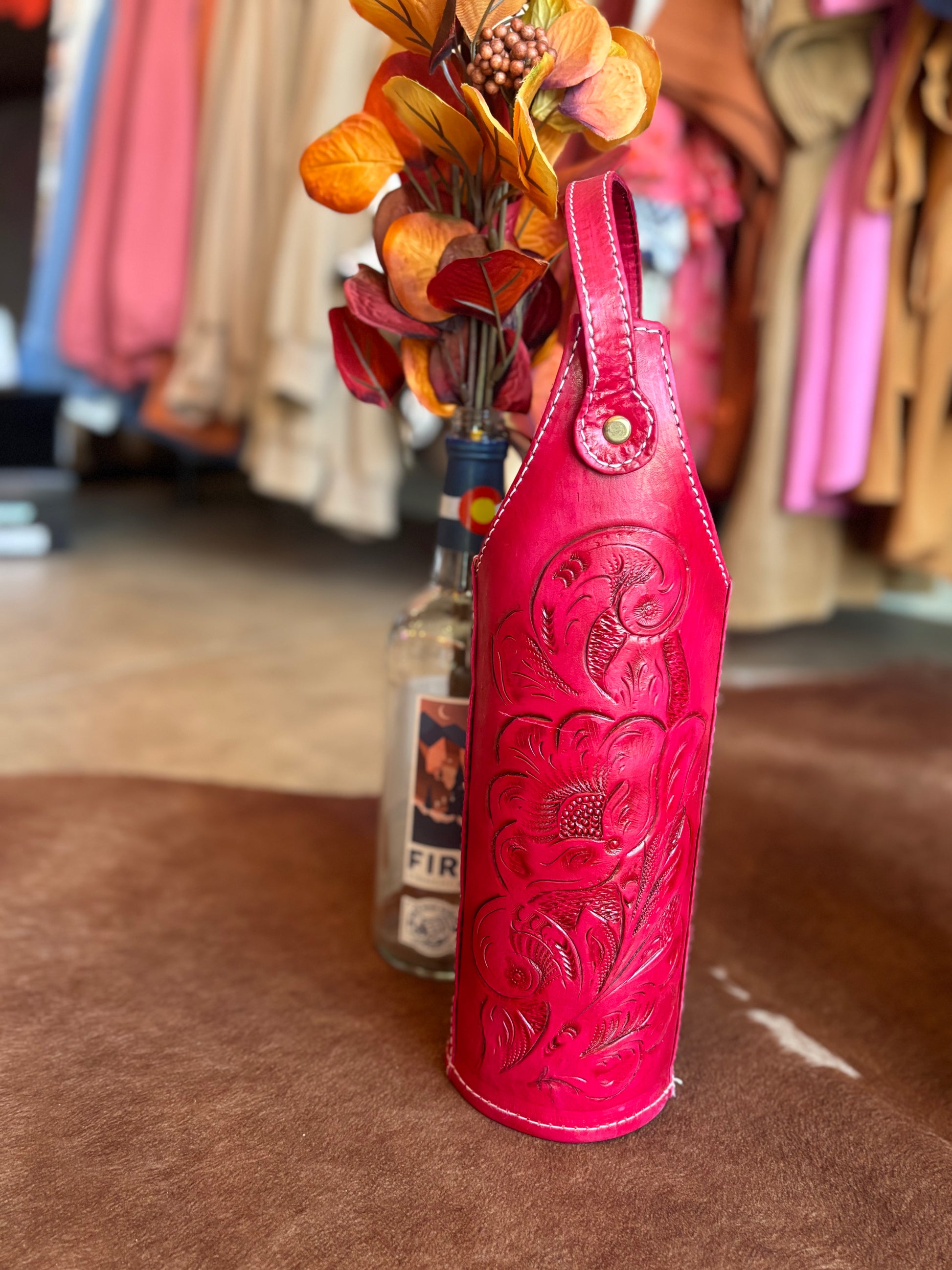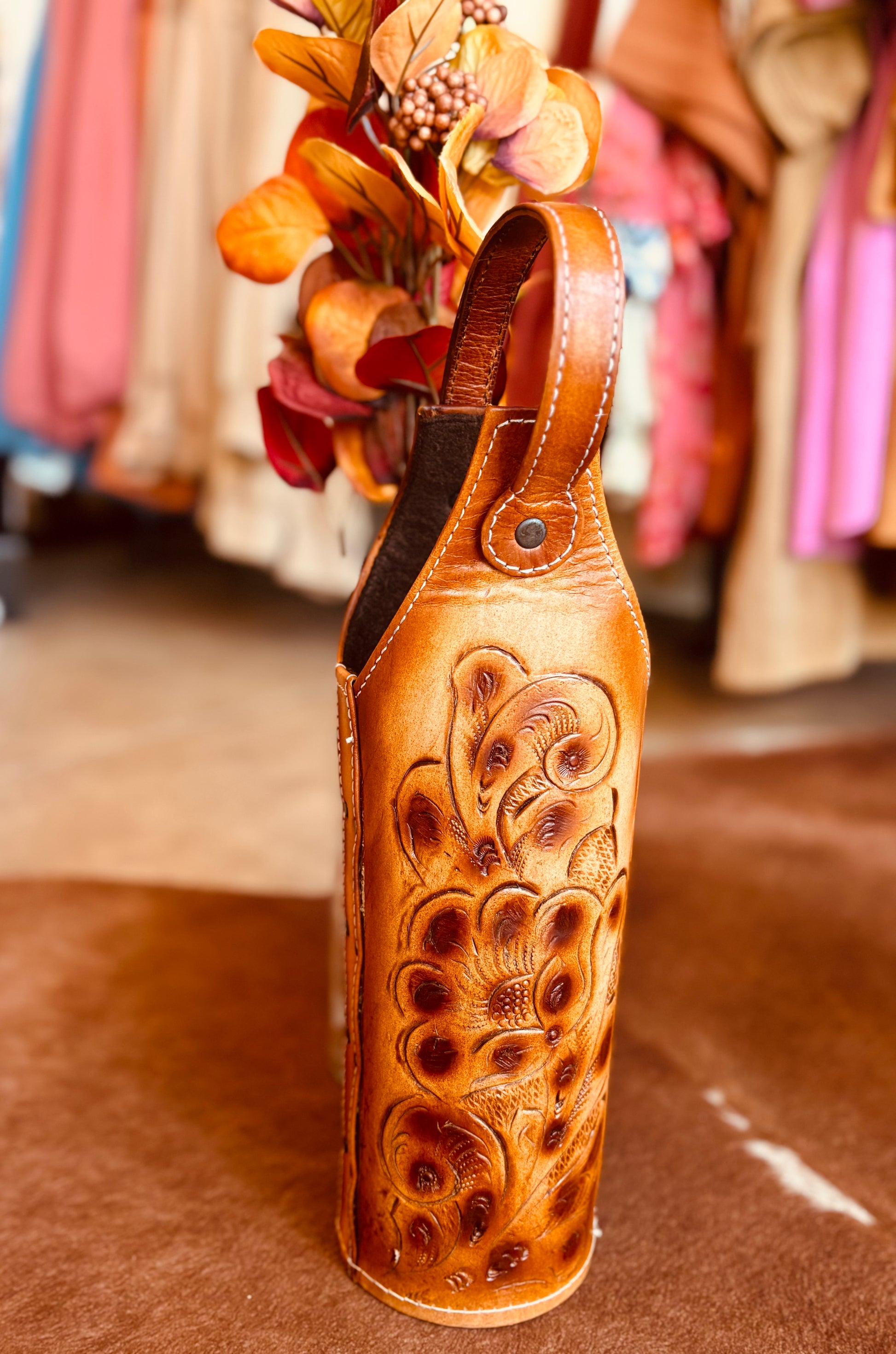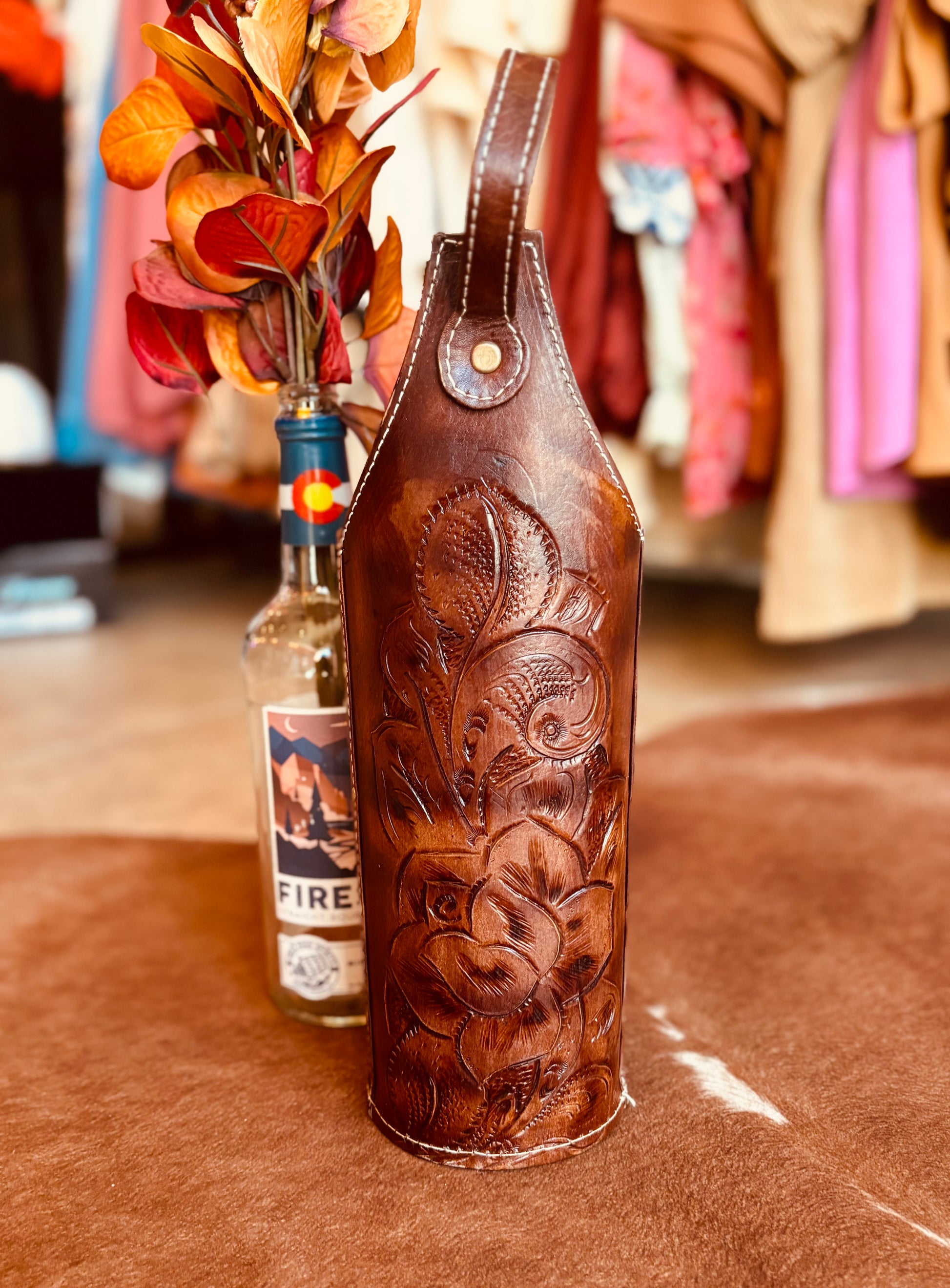 Beautifully hand crafted genuine leather wine or spirit holder. The perfect gift that keeps giving. The leather is tooled