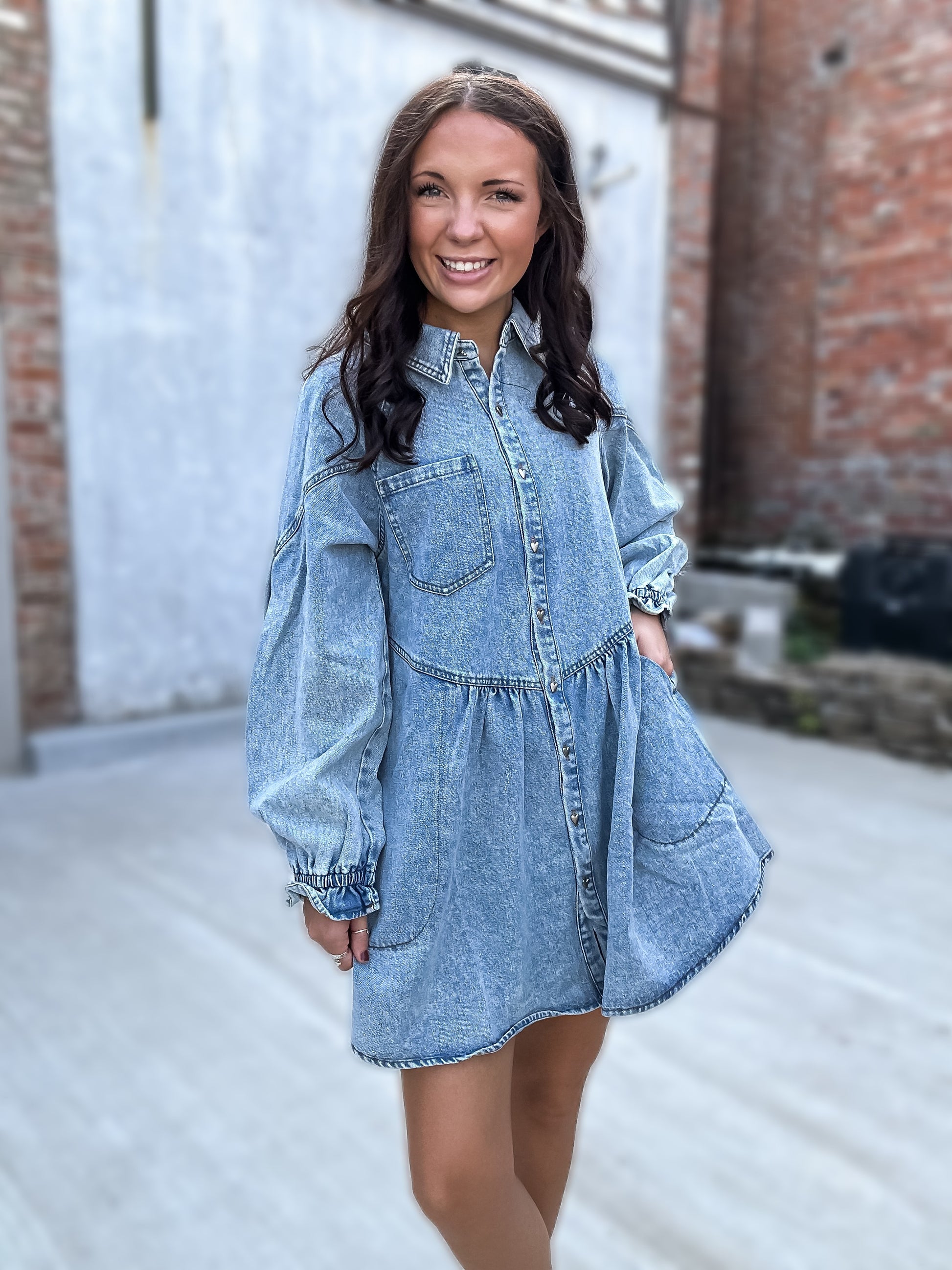 Meet the Vintage Vaquero Denim Dress — a vintage-washed dream that blends classic Western charm with effortless everyday style. This dress features a soft, lived-in denim wash, a relaxed babydoll silhouette, and the sweetest feminine touches.