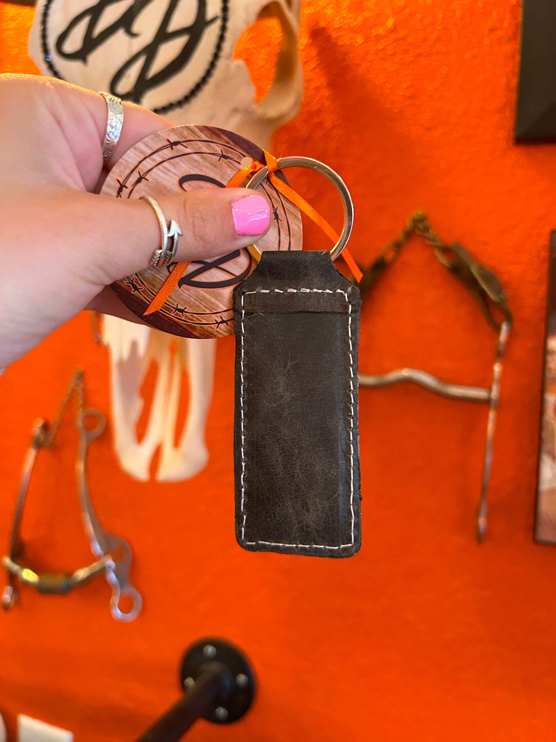 Crafted from genuine black leather and finished with classic boot stitching, this keychain brings a touch of western tradition to your everyday carry. Durable, timeless, and the perfect size for keys or as a rustic accessory for your bag.